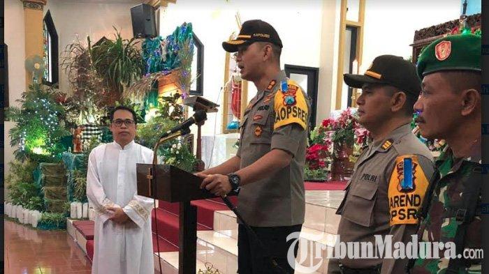 TRIBUNMADURA.COM, PAMEKASAN - Kapolres Pamekasan AKBP Teguh Wibowo ikut memantau langsung pelaksanaan Misa Natal di Pamekasan, Selasa (25/12/2018) pagi.