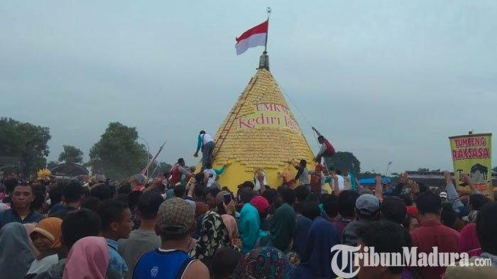 TRIBUNMADURA.COM, KEDIRI - Ribuan masyarakat antusias mengelilingi gunungan tahu takwa atau tahu kuning pada acara Festival Tahu di Lapangan Monumen Simpang Lima Gumul (SLG), Kabupaten Kediri, Minggu (30/12/2018).