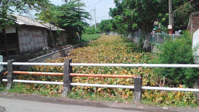 TRIBUNMADURA, SIDOARJO - Eceng gondok yang mulai tumbuh lebat di Sungai Cantel, Desa Tambak Sawah, Kecamatan Waru, Sidoarjo, berpotensi menghambat arus air.