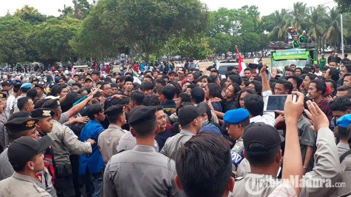 Saat aksi di depan Kantor Pemkab Jember, demi diwarnai aksi saling dorong antara mahasiswa dan demonstran.