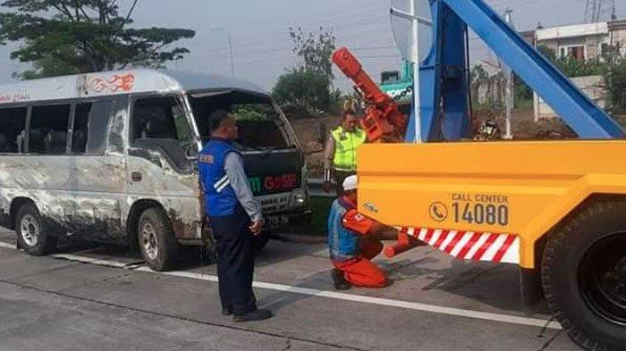 Sebuah Minibus Elf berpenumpang 14 orang menghantam pembatas jalan hingga terguling di Tol Waru, Selasa (31/12/2019).