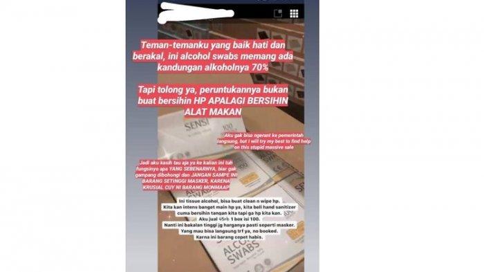 Awalnya, foto tersebut merupakan fitur story yang menampakkan beberapa kotak alcohol swab dan berisi keterangan, alcohol swab bisa digunakan untuk membersihkan layar ponsel dan alat makan, serta dinilai barang tersebut sedang dicari masyarakat.
