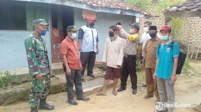 TRIBUNMADURA.COM, PAMEKASAN - Bhabinkamtibmas Desa Bulangan Haji, Bripka Abd Hamid bersama tiga pilar melakukan pendataan langsung ke rumah warga penerima Bantuan Langsung Tunai dari Pemkab Pamekasan, Rabu (6/5/2020).