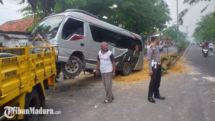 Mobil mini bus berplat nomor M 7136 V ini, dikemudikan oleh Badrus Syamsi, pria berusia 25 tahun, warga Desa Larangan Badung, Kecamatan Palengaan, Kabupaten Pamekasan, Madura.
