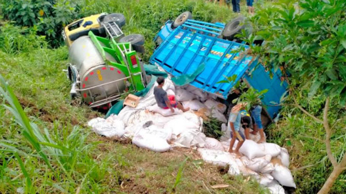 Truk muatan bekatul sempat menabrak tangki susu di belakangnya.