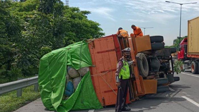 Truk Bak Terbuka Terguling di Tol Satelit Lantaran Ban Meletus, Sopir Selamat