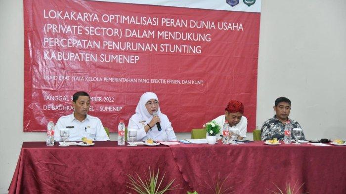 "Kami terus melakukan berbagai langkah nyata untuk menyelesaikan masalah-masalah stunting. Sehingga angka kasusnya menurun," tutur Wakil Bupati Sumenep Dewi Khalifah pada Lokakarya Optimalisasi Peran CSR dalam Mendukung Percepatan Penurunan Stunting yang berlangsung di Meeting Hall Hotel De Baghraf pada Rabu (9/11/2022).