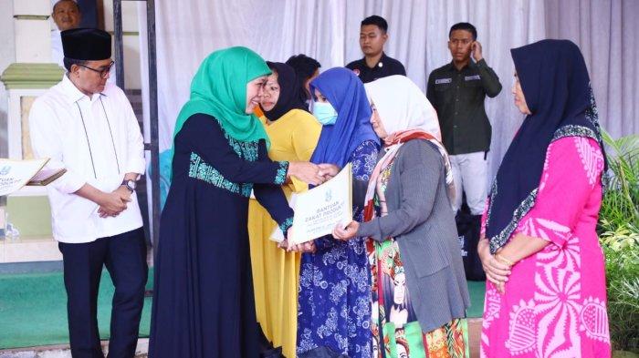 TRIBUNMADURA.COM, PAMEKASAN - Gubernur Jawa Timur, Khofifah Indar Parawansa membagikan Zakat Produktif untuk 100 pelaku usaha ultra mikro di Desa Batu Ampar, Kabupaten Pamekasan, Madura, Minggu (2/4/2023).