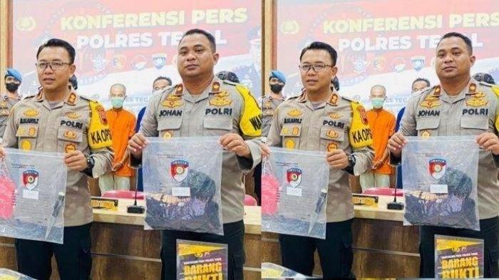 Darsono kini berhasil dibekuk Satreskrim Polres dan dihadirkan dalam pers rilis di Gedung SSB Mapolres Tegal, Selasa (11/4/2023).