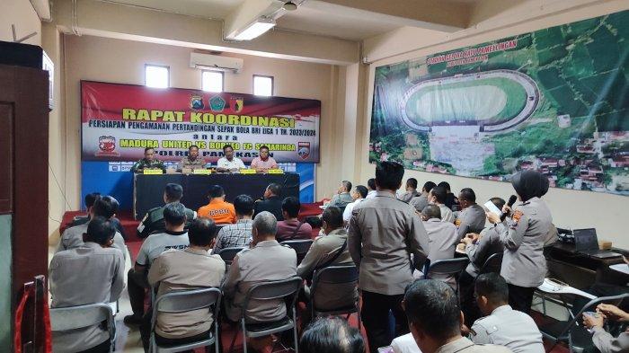 Polres Pamekasan, Madura menggelar rapat koordinasi (rakor) persiapan pengamanan laga home Madura United melawan Borneo FC di Stadion Gelora Ratu Pamelingan Pamekasan, Minggu (1/10/2023).