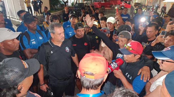 Pelatih Arema FC, Marcos Santos beserta para pemain dan official tim langsung menemui Aremania yang menghadang mereka.