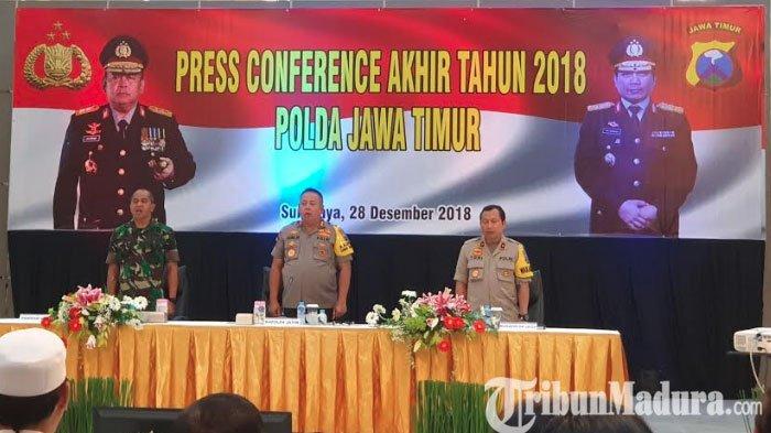 Polda Jatim menggelar press conference akhir tahun 2018 di Gedung Mahameru Polda Jatim, Jumat (28/12/2018).