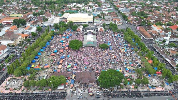 Ribuan warga menghadiri pengajian yang diisi oleh Muhammad Iqdam Kholid atau biasa disapa Gus Iqdam di alun-alun Ponorogo, Rabu (13/12/2023) siang.
